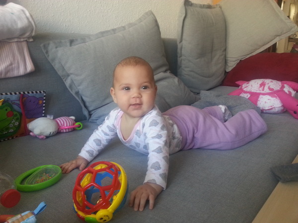 הישגים: היא ממשיכה לפתח את יכולות לפיתת צעצועים ומשיכתם. משחקת על הבטן ומסוגלת להחזיק את עצמה במשך 30-50 דקות. סימני טרום זחילה: סיבוב סביב עצמה על הבטן, ניסיון עמידה במשך כמה שניות על ארבע, כשהיא מכופפת ברכיים ונשענת על כפות הידיים ולא על כל האמה. אם ניתן לה קונטרה לרגליים, מרימה את הישבן, מקפלת את הרגל ומתקדמת אל עבר המטרה (הצעצוע החדש והמדליק שקניתי לה). היא גם אוהבת לקפצץ ולנסות להיעמד על ברכיים או על כף הרגל כשאני מחזיקה אותה על הידיים, על הכרית ההנקה.